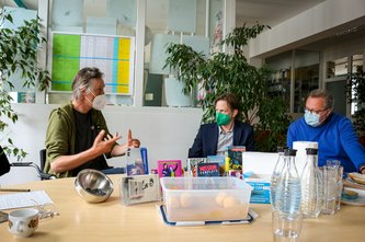 Im Rahmen der anstehenden Landtagswahl in Nordrhein-Westfalen besuchten Dr. Heiko Knopf, stellvertretender Bundesvorsitzender von BÜNDNIS 90/DIE GRÜNEN, und der Wuppertaler Direktkandidat Andreas Zawierucha das Medienprojekt Wuppertal. Geschäftsführer Andreas von Hören berichtete über die Arbeit und vor allem die Arbeitshaltung des Projektes: „Es geht nicht darum, objektiv zu sein. Es geht darum, Haltungen und Meinungen junger diverser Menschen sichtbar zu machen – über das Medium Film.“