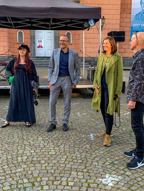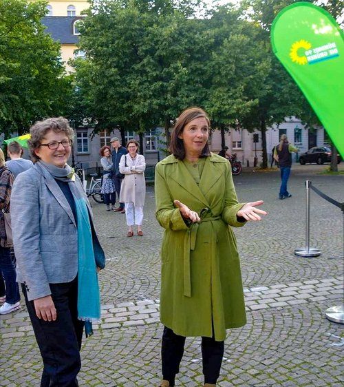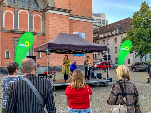 Die Fraktionsvorsitzende im Deutschen Bundestag von BÜNDNIS 90/DIE GRÜNEN, Katrin Göring-Eckardt hat am 24. August 2021 um 19 Uhr gemeinsam mit der Wuppertaler Direktkandidatin Anja Liebert an einer Fragerunde auf dem Laurentiusplatz in Wuppertal-Elberfeld teilgenommen. Eröffnet wurde die Veranstaltung mit einem sehr persönlichen Lied der Musikerin Anna Luca, deren Großvater und seine Wertschätzung der Natur Inspiration für die Sängerin war, Teil der Grünen zu sein.