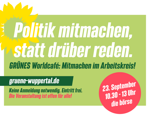 Um unsere Demokratie lebendig zu halten, ist Teilhabe und Teilnahme gefragt: Hierfür laden wir alle Wuppertaler*innen am 23. September von 10:30 Uhr bis 13 Uhr in die Börse ein, um einen offenen Einblick in unsere politischen Strukturen und die Möglichkeiten zu direkter Teilhabe an grüner Stadtpolitik anzubieten.