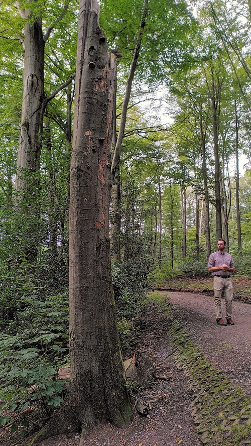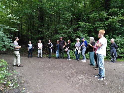 Bei einem Spaziergang erläuterte Sebastian Rabe die Gefährdung bestimmter Baumarten z.B. durch Borkenkäfer und Pilzbefall. Die Zuhörer*innen erfuhren, mit welchen Methoden die Förster den Wald mit viel Einsatz am Leben erhalten, und welche Rolle der Klimawandel bei den aktuellen Problemen spielt. Das fundierte Wissen des Exkursionsleiters und seine Sicht auf die langfristige Waldentwicklung eröffnete den Zuhörer*innen neue Perspektiven auf die ernste Lage im Talsperrenwald.