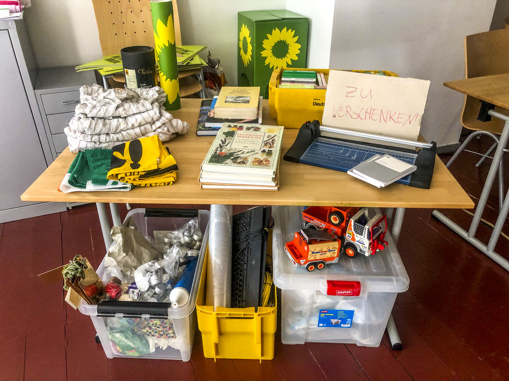 Wir haben das Lager des Kreisverbandes aufgeräumt, geputzt und aussortiert – dabei fiel uns einiges in die Hände, was hier nicht mehr genutzt wird, aber zu schön zum Wegwerfen ist: Von Büchern über Plakate zu Party-Zubehör und kiloweise Grillkohle. Die Sachen liegen im Grünen Büro auf einem “Zu Verschenken“-Tisch für euch bereit. Eine genaue Übersicht findet hier:
